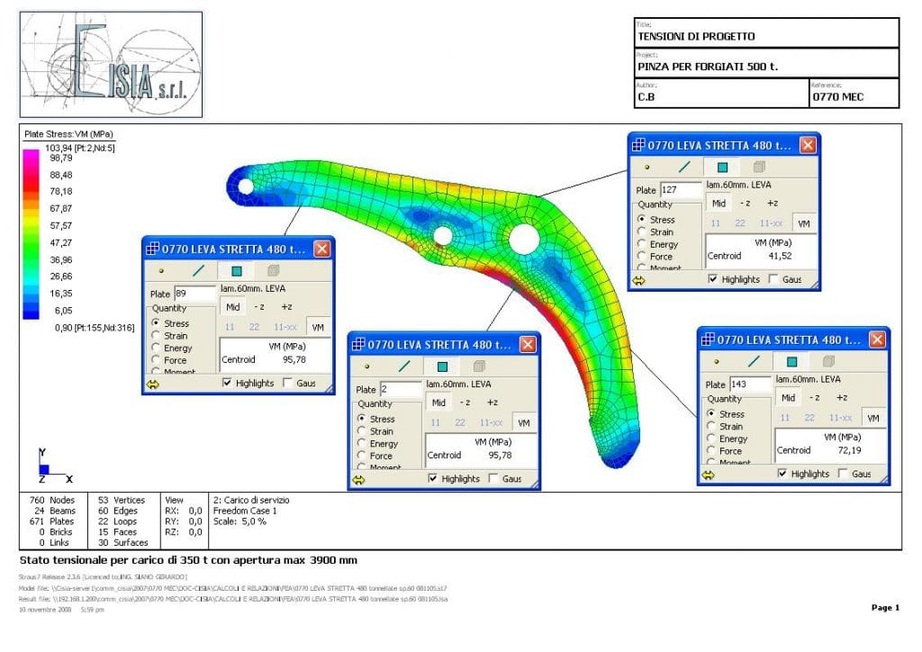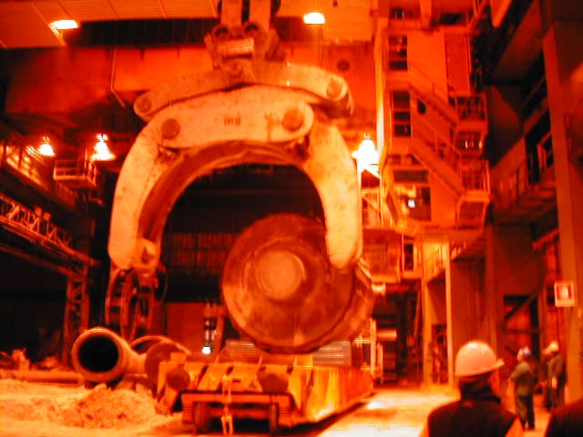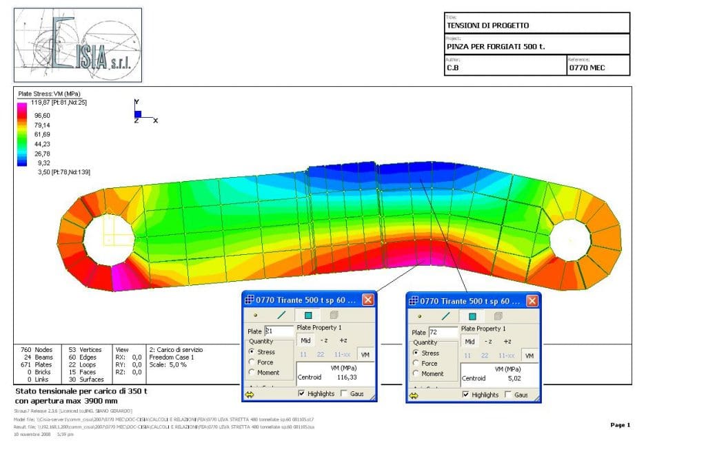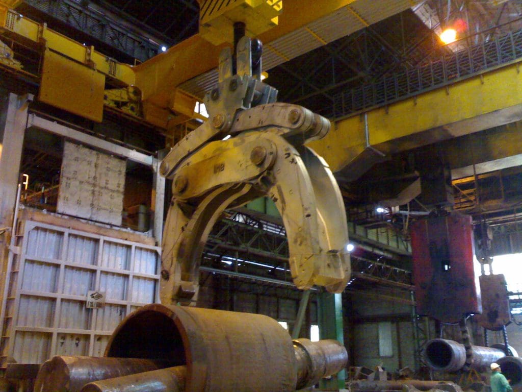 The equipment consists of a system of linkages that allow the two gripping arms, under the action of the lifting force exerted by the crane hoist, to support an ingot weighing up to 5,000 kN between the gripping tips.