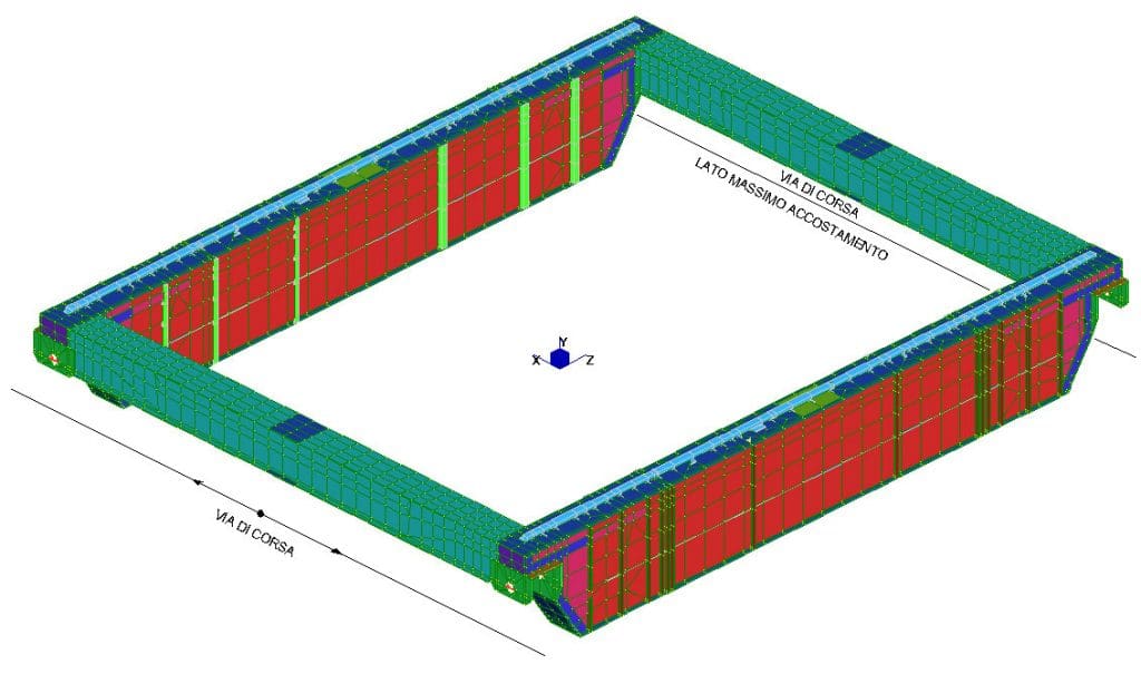 Le travi sono a cassone in lamiera saldata ed ha uno scartamento di 12,15m.